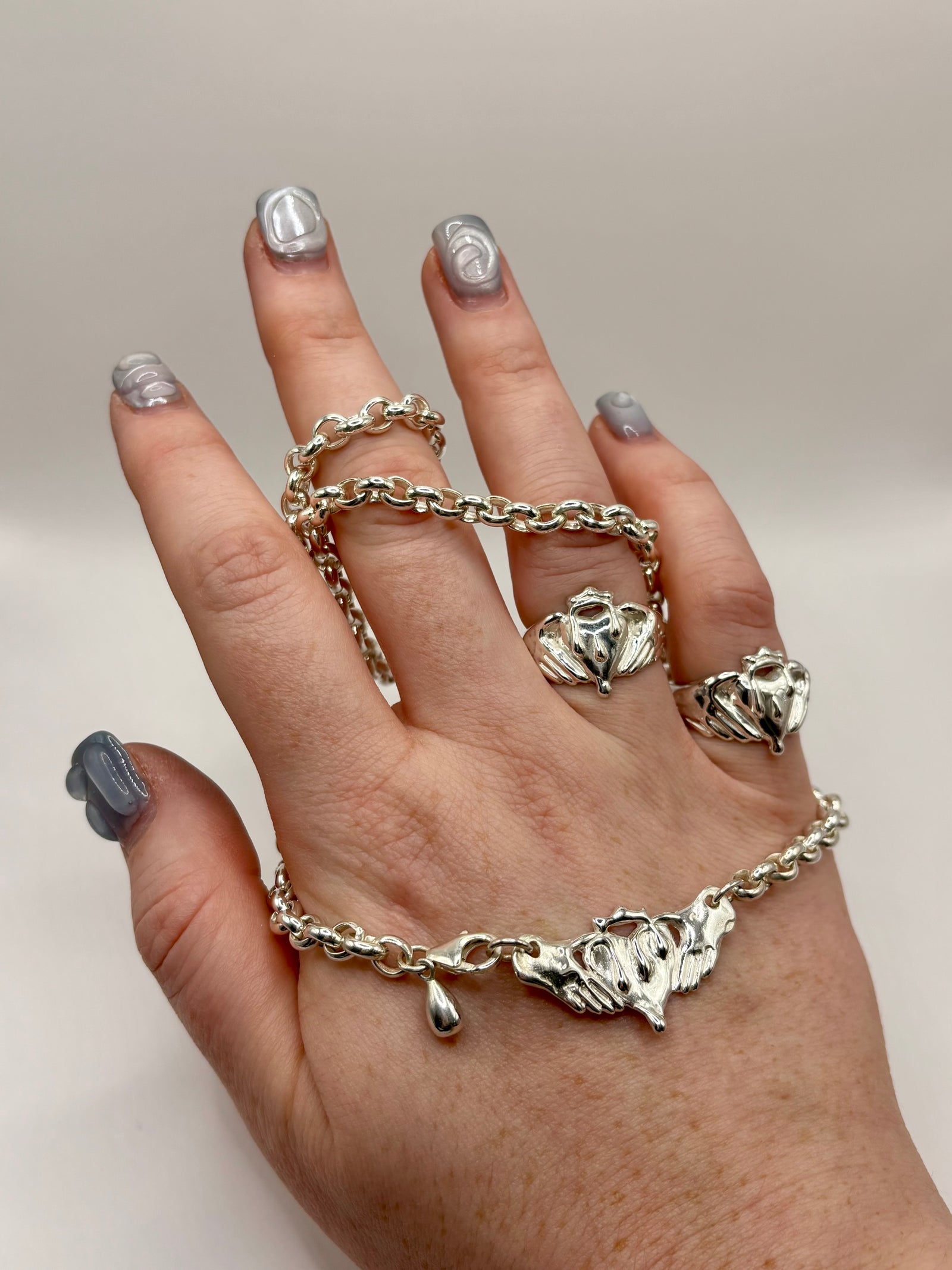 Hand made sterling silver jewellery. Designed and made to order in the UK, molten and drippy take on the traditional Claddagh design.