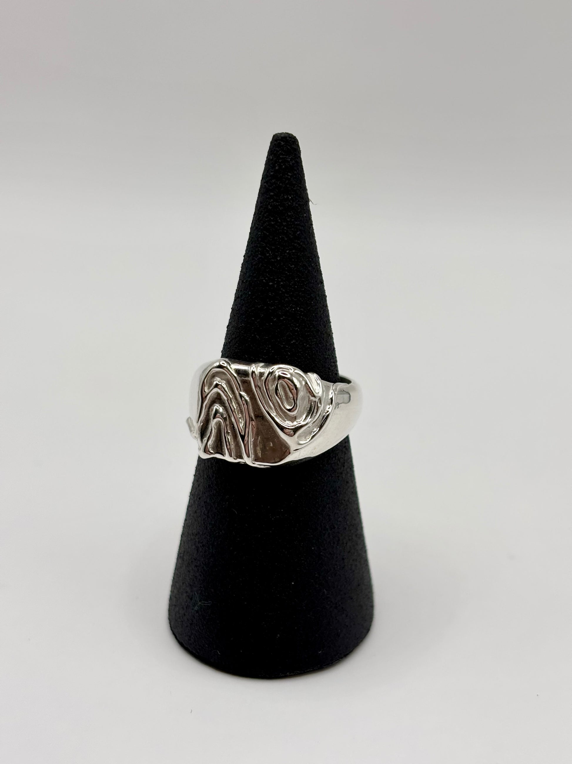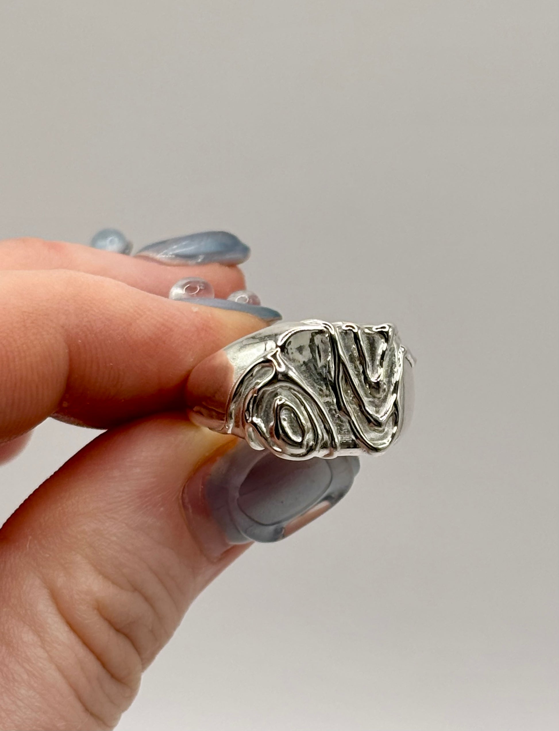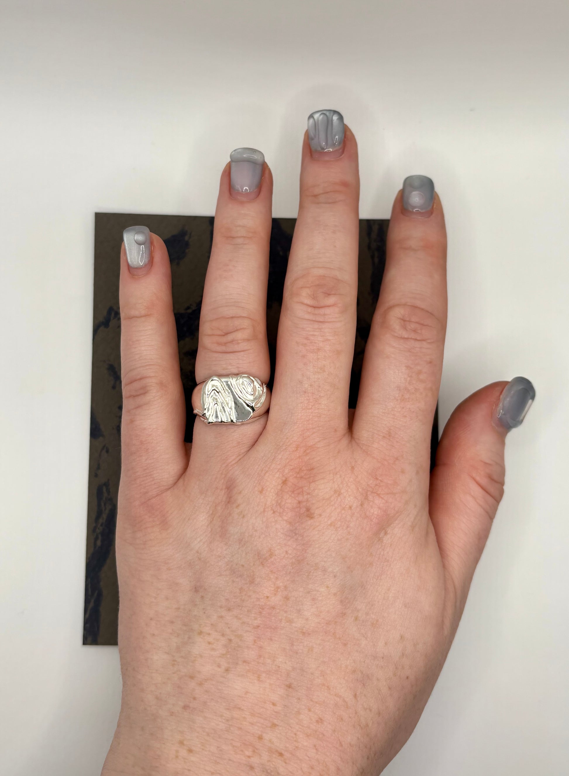 Sterling silver, cushion cut signet ring. Organic textured head.